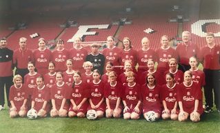 SBC co-founder Carine Ireland (2nd row, 2nd from left) in Liverpool FC womens team photo at Anfield. Carine started and played every game in 2002 season, scoring both game winning goals vs.Wolves